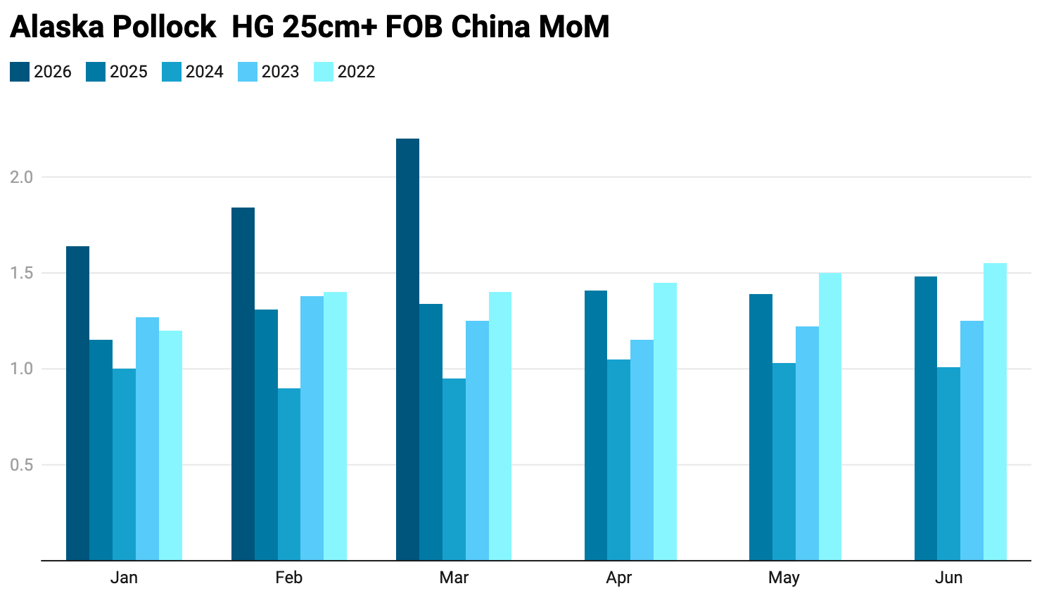 Historically, Alaska pollock prices tend to hit seasonal lows around Chinese New Year and gradually strengthen toward year-end.